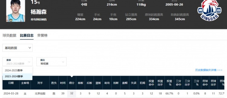 据统计,杨瀚森此前在CBA青岛男篮的单场最高分,是在2024年3月28日对阵北控时拿到的32分。